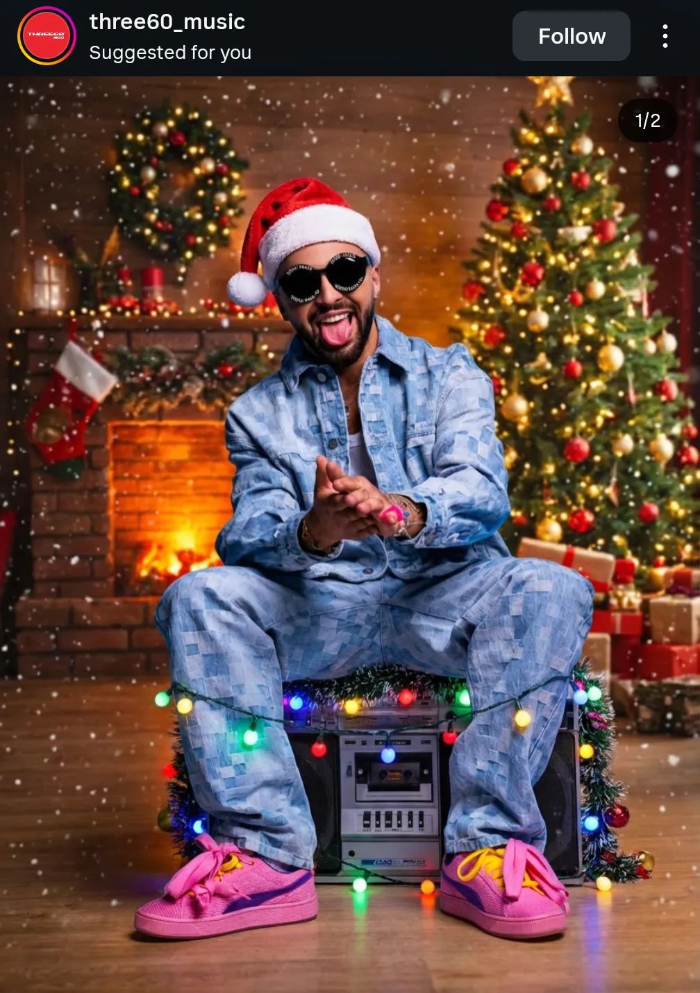 Në një imazh festiv të publikuar, Gjesti shfaqet me stilin e tij ikonik: xhins dhe atlete rozë të ndezura, nën dritat e pemës së festave.