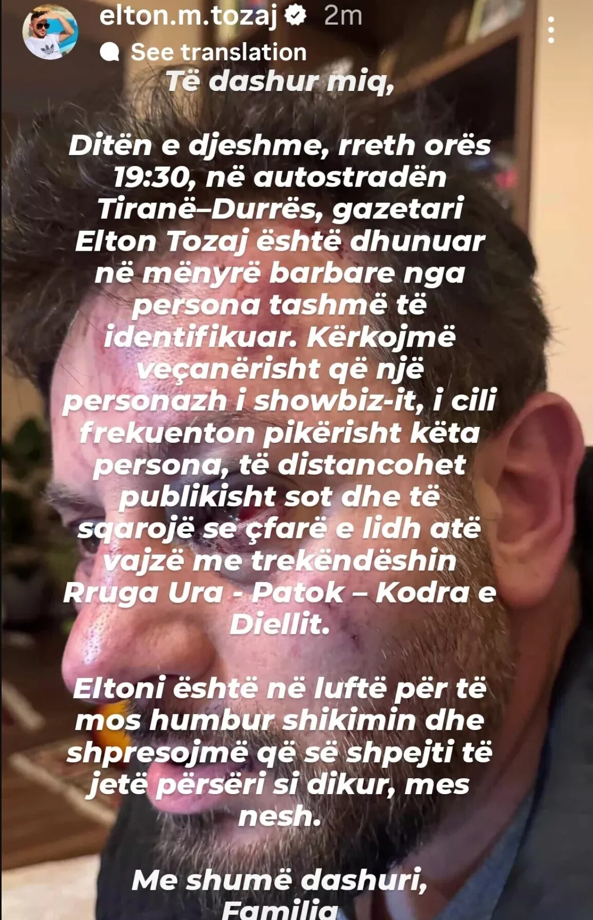 Gazetari dhe ish-banori i “Big Brother Albania”, Elton Tozaj, ka rënë pre e një dh une bar bare që e ka lënë me dë mtime të rënda fizike, duke rrez ikuar seriozisht shikimin e tij.