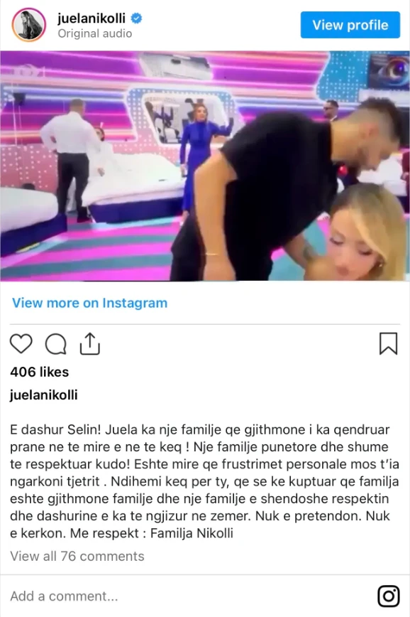 Ndihemi keq për ty, që se ke kuptuar që familja është gjithmonë familje dhe një familje e shëndoshë respektin dhe dashurinë e ka të ngjizur në zemër. Nuk e pretendon. Nuk e kërkon. Me respekt: Familja Nikolli”, shkruajnë familjarët e banores së shtëpisë më të famshme në Shqipëri.