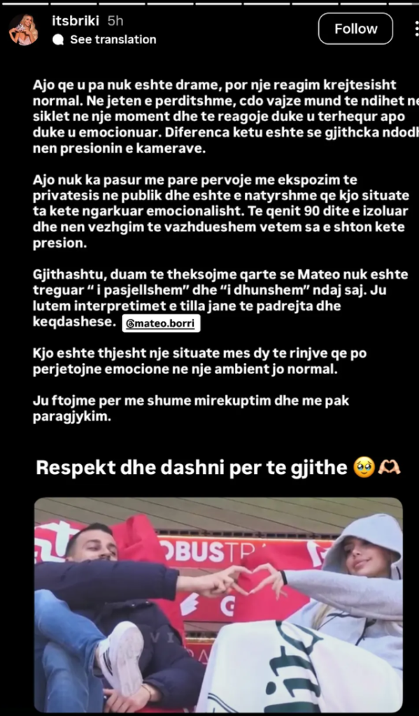 “Gjithashtu, duam të theksojmë qartë se Mateo nuk është treguar ‘i pasjellshëm’ dhe ‘i dhunshëm’ ndaj saj. Ju lutem interpretimet e tilla janë të padrejta dhe keqdashëse. Kjo është thjesht një situatë mes dy të rinjve që po përjetojnë emocione në një ambient jo normal. Ju ftojmë për më shumë mirëkuptim dhe me pak paragjykim.”