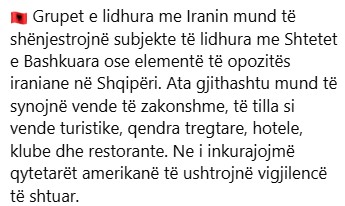 Grupet e lidhura me Iranin mund të shënjestrojnë subjekte të lidhura me Shtetet e Bashkuara ose elementë të opozitës iraniane në Shqipëri. Ata gjithashtu mund të synojnë vende të zakonshme, të tilla si vende turistike, qendra tregtare, hotele, klube dhe restorante. Ne i inkurajojmë qytetarët amerikanë të ushtrojnë vigjilencë të shtuar.