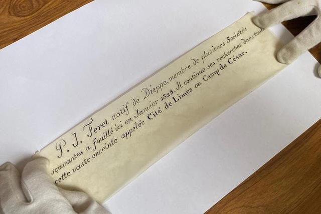 Në mesazhi thuhej: “PJ Féret, me origjinë nga Dieppe, anëtar i shoqërive të ndryshme intelektuale, kreu gërmime këtu në janar 1825. Ai po vazhdon kërkimet e tij në këtë zonë të gjerë të njohur si Cité de Limes ose Fusha e Cezarit”, ku Féret ishte një figurë e rëndësishme e vendit, sipas të dhënave komunale të cilat vërtetojnë se ka qenë ai që ka kryer gërmimin e parë në atë vend. “Ishte lloji i shishkës që gratë mbanin rreth qafës që përmbante kripëra me aromë.