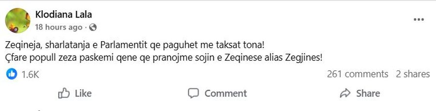 “Zeqineja, sharlatanja e Parlamentit që paguhet me taksat tona! Çfarë populli i mjerë paskemi qenë që pranojmë sojin e Zeqinesë, alias Zegjines!”, shkruan gazetarja në postimin e saj.