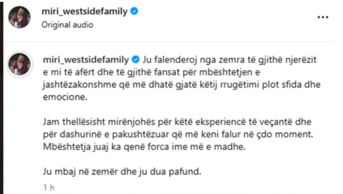 Në mesazhin e tij të ndjerë, anëtari i West Side Family shkruan: “Ju falënderoj nga zemra të gjithë njerëzit e mi të afërt dhe të gjithë fansat për mbështetjen e jashtëzakonshme që më dhatë gjatë këtij rrugëtimi plot sfida dhe emocione.